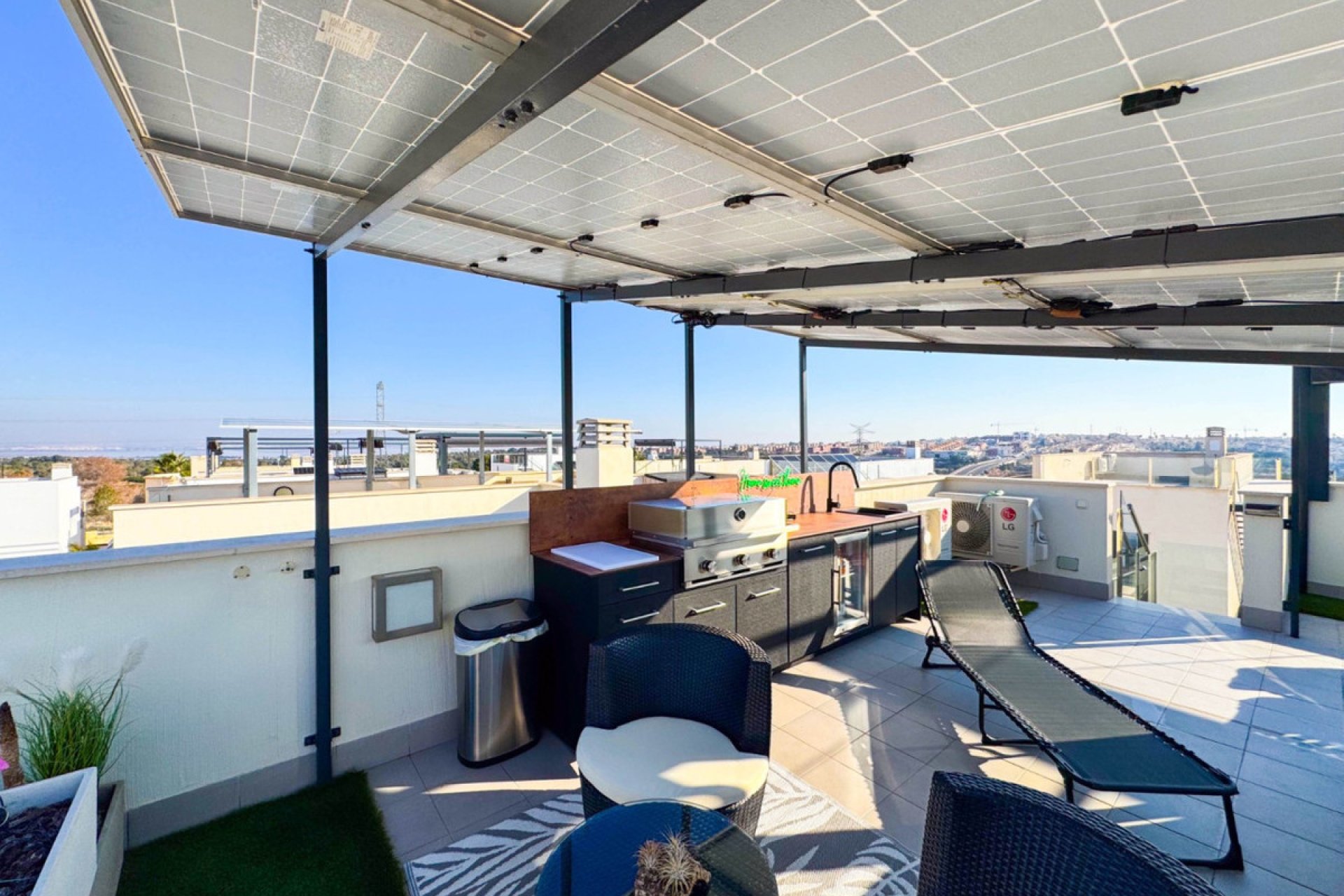 Subiendo a la primera planta, se encuentran 2 amplios dormitorios, con armarios empotrados y vistas agradables a la zona exterior. La planta se completa con otro baño completo de diseño moderno y funcional. Desde esta planta, accedes a un espectacular solárium privado de 37 m², con una zona de comedor, una pérgola que te proporcionará sombra y una cocina de verano recién instalada, perfecta para disfrutar de los días soleados y las noches al aire libre.