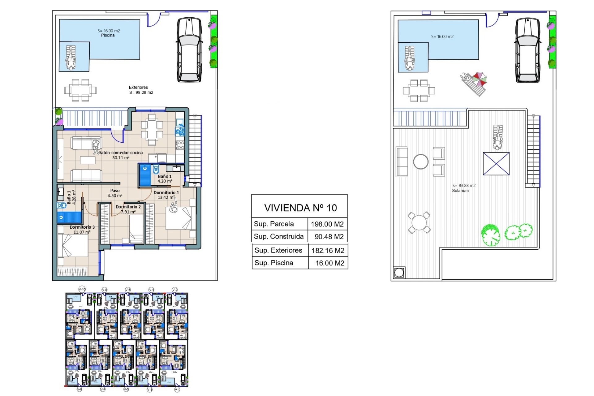 Las viviendas cuentan con un diseño exterior que incluye un jardín privado, ideal para disfrutar del clima mediterráneo. Además, cada propiedad dispone de una terraza y un solárium, proporcionando espacios adicionales para el ocio al aire libre. La inclusión de una piscina privada en cada vivienda añade un toque de lujo y exclusividad, permitiendo a los residentes disfrutar de momentos de relax y diversión sin salir de casa.