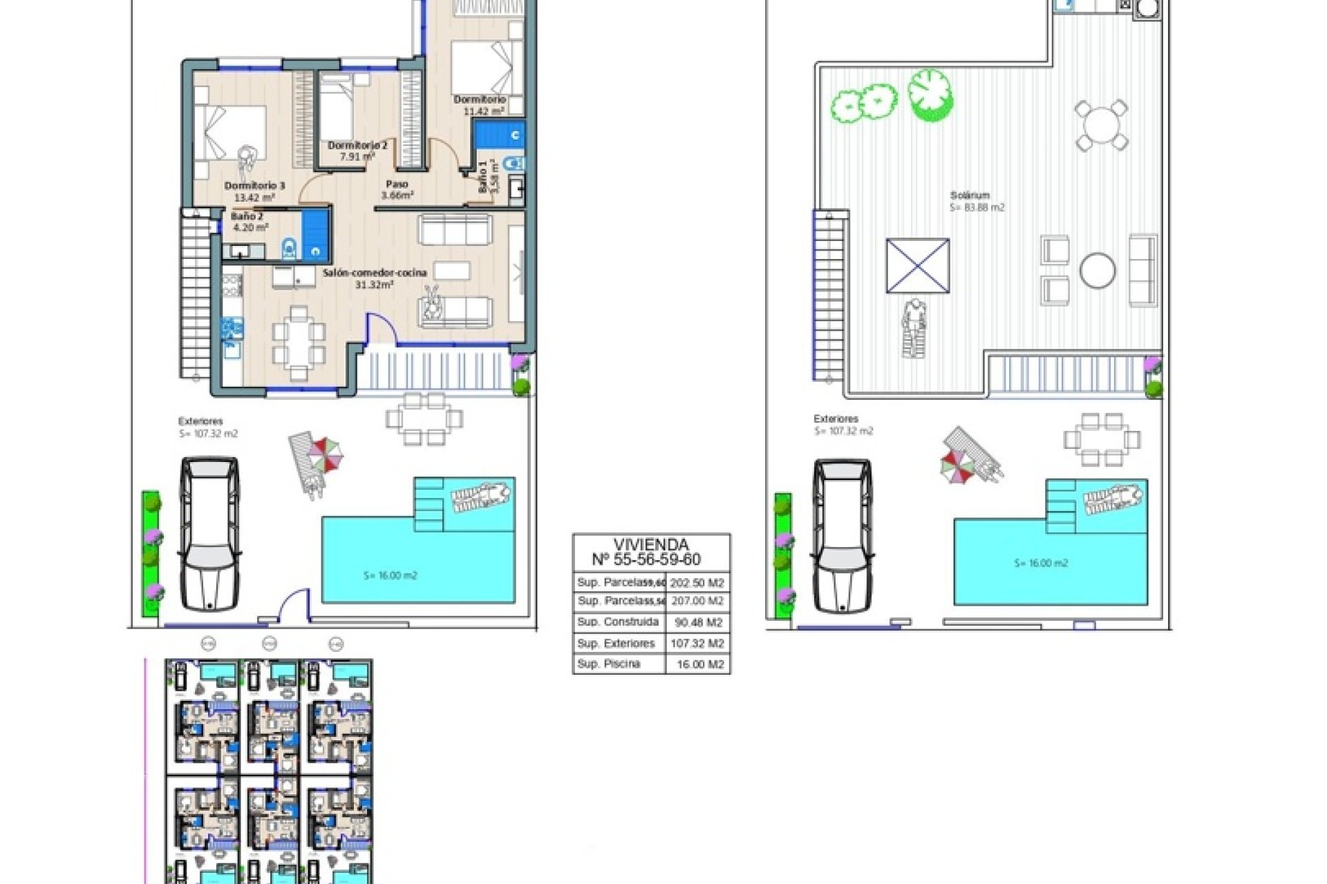 A lakások külső dizájnja magában foglal egy privát kertet, amely ideális a mediterrán éghajlat élvezetére. Ezenkívül minden ingatlan rendelkezik terasszal és napozóterasszal, amelyek további szabadtéri szabadidős tereket biztosítanak. Minden lakásban található privát medence luxust és exkluzivitást kölcsönöz, lehetővé téve a lakók számára, hogy élvezzék a pihenés és szórakozás pillanatait anélkül, hogy elhagynák otthonukat.